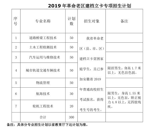 ③革命老区建档立卡专专项计划录取严格按照皖教办[2019]3号及相关文件要求执行,按照志愿优先、专业优先、应录尽录原则录取。